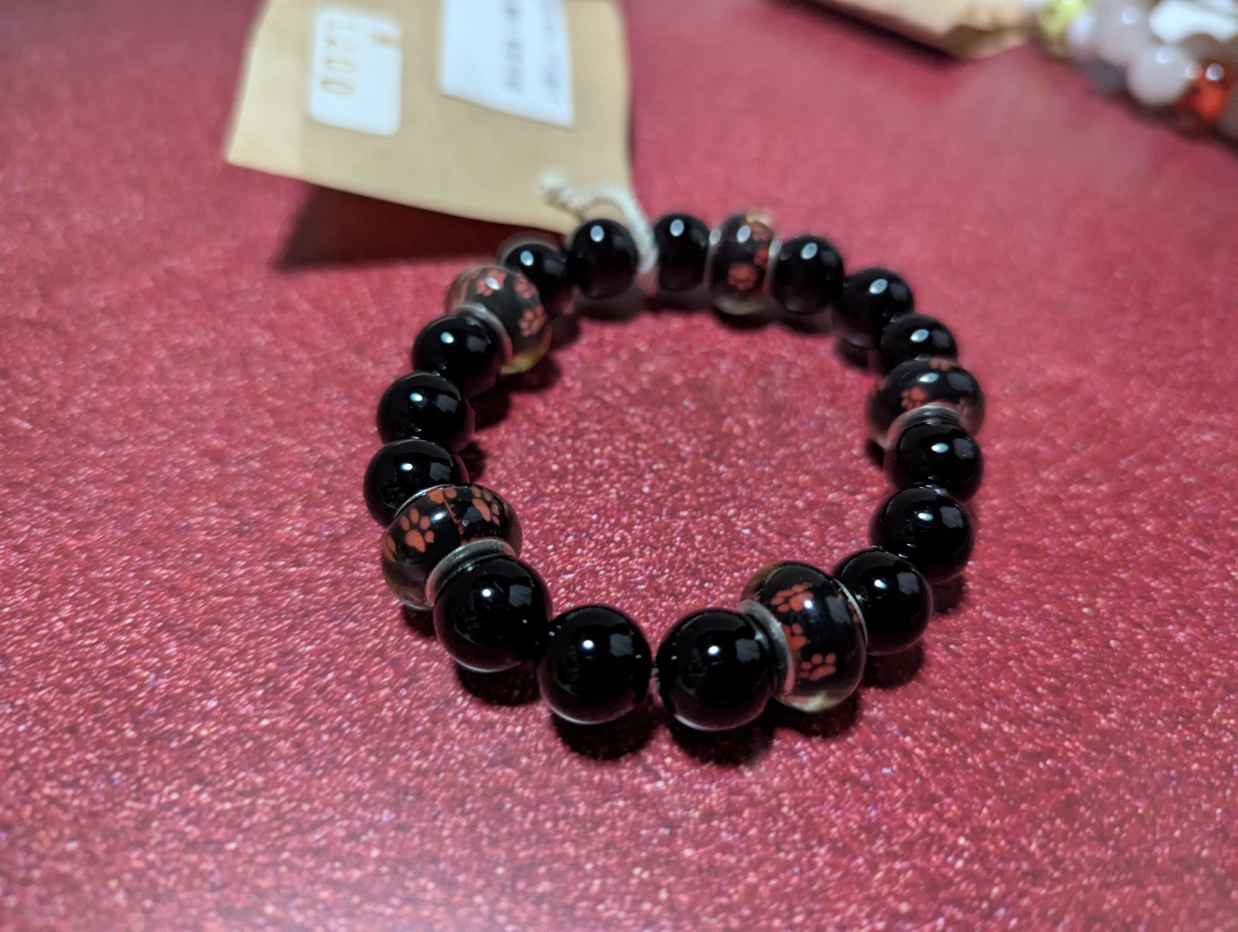 8mm玉のオニキスに肉球柄のトンボ玉をはいしています